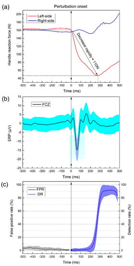 For all subjects, a strong synchronous evoked neural responses and common behavioral responses were observed to be associated with the onset of postural perturbation. Figure 2 shows the time-synched handle reaction force, grand average event-related potential (ERP) at FCZ channel, and perturbation detection performance based on EEG features.