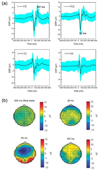(a) Grand-average ERP record at midline channels, C3 and C4 channels; (b) Time-spatial topography in rest state and ERP peaking. The perturbation evoked negative potential was mainly located at frontal-central channels, especially mean amplitude peaking at FCZ around 62 ms.