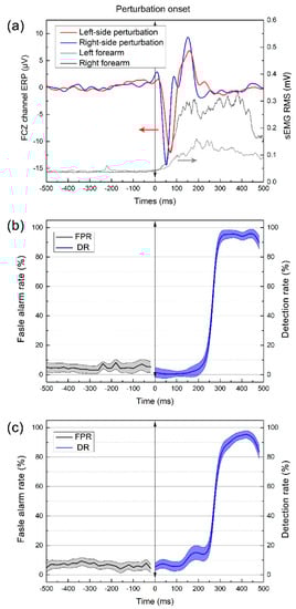 Figure 2b shows baseline of potential at non-task state (−500 ms to 0) and the postural perturbation event evoked a nearly −15 μV negative potential at FCZ channel within 100 ms, which is much higher than most of sensory, visual, or auditory evoked potential. This phenomenon indicated that the human central nervous system had a rapid and strong response to postural perturbation events, which is consistent with numerous previous studies showing that perturbation evokes ERP at frontal-central channels [,] which constituted the foundation of perturbation detection based on EEG features.