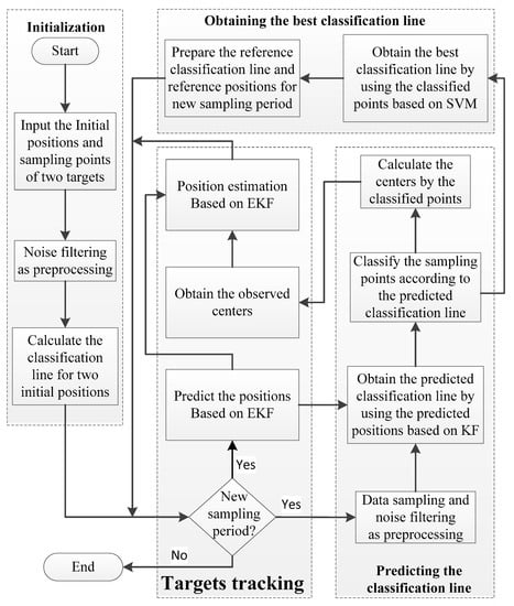 As shown in Figure 1, the whole process of our new algorithm consists of four portions: initialization, predicting the classification line, obtaining the best classification line, and target tracking. Initialization provides the initial values for EKF and the original sampling points for LS-SVM algorithm, as well as the best classification line. The predicted positions of targets will be calculated based on the EKF algorithm and then applied to predict the classification line. Besides, the measurement points sampled by sensors in WSNs with noise points filtered out by using some simple filter would be classified by the predicted classification line. Subsequently, the geometric centers of these classified points will be regarded as observed centers of targets, which could be adopted to estimate the positions of targets based on EKF algorithm. Meanwhile, the classified points will also be devoted to train the best classification line based on LS-SVM algorithm, which will be taken as the reference classification line for the next sampling period.