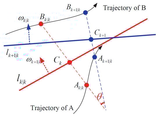 The initial parameters mainly refer to the best classification line and observed centers at the very beginning of the algorithm. For the following sampling periods, the best classification line at time will be regarded as the reference classification line at moment . Later, after predicting targets’ positions at time based on EKF, the predicted classification line at time will be obtained by transforming the reference classification line according to the positional relationship between predicted targets positions at time and observed targets centers at (through following steps 2–5).