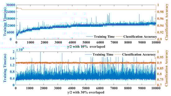 The parameter γ, which is shown in (20), is needed to be determined before program running. Theoretically, a bigger γ will increase the difficulty of calculation, while a smaller one will reduce the balance effect. In order to determine a proper γ, we simulated a classification by using the measurement points of two targets in different overlapping ranges and optimized the value of γ/2 from 1 to 10000. The overlap range is set from 0% to 30% for simulation, with the simulation result listing in Figure 3. The subfigure above shows the influence of the selection of γ on the running time and classification accuracy under 10% of the overlapped range, and the subfigure below lists the test under 30% of the overlapped range. Clearly, we get a balance between running time and classification accuracy when the γ/2 will be assigned within 1000.