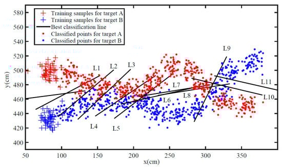 In order to verify the classification performance of the proposed algorithm, we firstly simulate the classification of the two targets within 11 groups of continuous sampling periods, which is shown in Figure 4. Here, L represents the best classification line for each sampling period. The whole simulation process involves two different motion states of targets: parallel state (L2–L5) and crossing state (L9–L10). Figure 4 reveals that the proposed algorithm can basically distinguish the sampling points of two targets, even though two targets are sometimes very close to each other. Besides, once two targets move separately (L6–L8, L11), the best classification line will effectively reduce accumulative error.