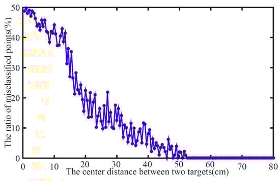 Moreover, a Monte Carlo simulation with s was taken to analyze the classification performance. We have recorded the number of misclassified points and center distance between two targets. Figure 5 reports the probabilities of misclassification over center distances of two targets. As the radius of targets is set to 20 cm, the classification performance of our proposed algorithm becomes increasingly promising while the center distance is bigger than 30 cm, especially 50 cm (while two targets completely separate from each other).