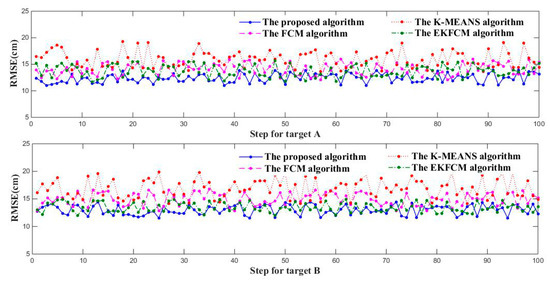 In order to evaluate the performance of the proposed algorithm for tracking adjacent targets, several simulations have been done and compared with some existing algorithms, namely K-means [16], Fuzzy C-means(FCM) [14] and EKFCM [13] clustering algorithm, which are all combined with the same tracking EKF algorithm. Besides, the root mean square error (RMSE) and Mean RMSE (MMSE) of the position are chosen as performance metrics [25].