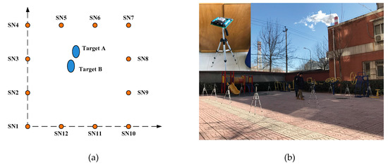 Experimental setup: the distribution of the sensor. (a) The distribution of sensors; (b) The experimental scene.