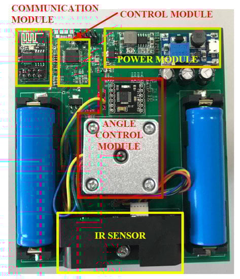 The sensor node consists of five parts: infrared ranging (IR) sensor, angle control module, wireless communication module, control module, and power supply module, which is shown in Figure 8. Specifically, the effective detection distance of the IR sensor is up to 5 meters, and the angle control module drives a stepping motor with a step angle of 7.2°. Here, a sampling period is defined as the time required by the sensor node to turn half a circle. Each sampling period is 0.5 s and includes 25 sampling windows. All the sampling data will be sent to the host computer by wireless communication module with model ESP8266. The control module here is hired to initialize and manage other modules. Two people are the targets of the practical experiment. Once beginning, they enter the surveillance region with a speed of approximately 1m/s and walk along the predefined routes. During the whole experiment, they will move closely with each other and even cross several times. While two persons keep walking, the sensor nodes sample target positions and then update the data to the host computer, which will be analyzed by the proposed algorithm to track adjacent targets.