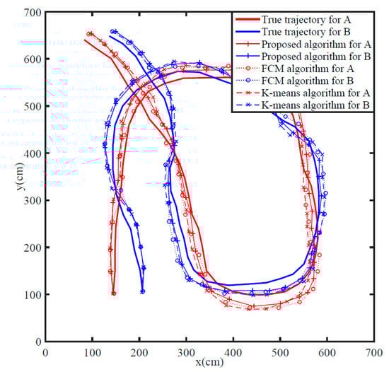 Based on the above experimental setup, sequence data were collected from two closely moving persons and then used to estimate the target trajectory by the presented algorithm, K-means, and FCM methods separately, see Figure 9.