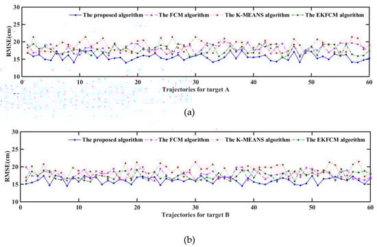 RMSE of 60 trajectories for targets A and B. (a) RMSE of these algorithms for Target A; (b) RMSE of these algorithms for Target B.