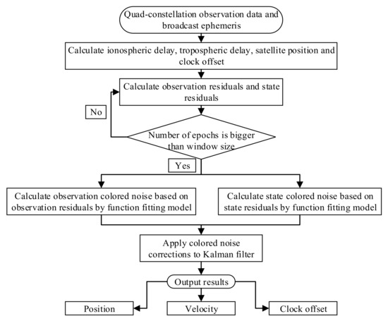 The Kalman filter solution can be obtained using Equations (13) and (14). The flow chart of the quad-constellation SPP solutions with mitigation of colored noise is shown in Figure 1. First, the quad-constellation observation data and broadcast ephemeris are collected in the navigation. Then, the ionospheric delay and tropospheric delay are corrected using the Klobuchar ionospheric model and Saastamoinen tropospheric model, respectively [23,24]. The satellite position and satellite clock offset are calculated using broadcast ephemerides. Next, the standard Kalman filter method is used to get observation and state residuals. Subsequently, the observation colored noise and state colored noise are predicted by a moving-window functional model, as shown in Equations (9)–(12). Finally, the colored noise is corrected in the Kalman filter, as shown in Equations (13) and (14), and the Kalman filter position solution is obtained.