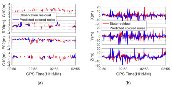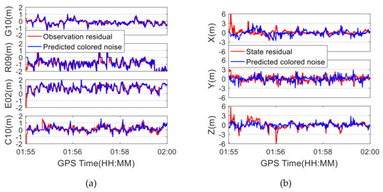 In the Kalman filter processing, the observation colored noise and the state colored noise mostly remain in the observation residuals and state residuals, respectively [16,17]. Thus, the observation residual sequence and state residual sequence can be used to predict the colored noise for correction in the next epoch. The fitting process of the observation colored noise is illustrated as an example in the following part.