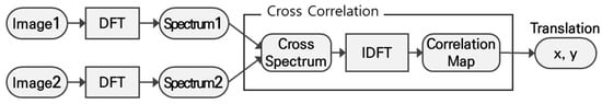 Frequency domain matching is conducted by analyzing the correlation between two spectrums in the frequency domain. The overall matching process is shown in Figure 2. We transformed two images into spectrums of the frequency domain using DFT. Then, we generated a correlation map between the two spectrums by multiplying them and applying IDFT. Position (x, y) of a peak point with the largest value in the correlation map indicates the amount of translation between the two images [,,,].