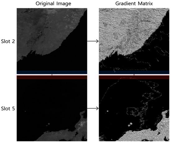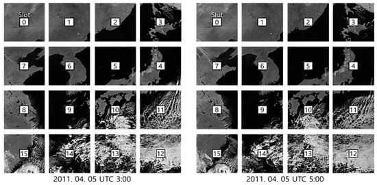 For the experiments, we used eight GOCI Level 1A datasets obtained from noon to 7 o’clock on 2011-04-05 UTC. Note that the GOCI Level 1A data came with radiometric correction and without geometric correction. GOCI Level 1A consists of 16 slots and each slot has 1413 X 1430 pixels. The GOCI can acquire images in eight bands (six visible bands, two near-infrared bands). The GSD (ground sample distance) of GOCI at the center of target area is 500 m. Since GOCI can perform acquiring and transferring 16 slots in less than 30 min [], the time intervals between slots was less than 1.875 min. In this paper, we used the near infrared No. 8 band, which has an advantage in matching because clouds, soil, and ocean regions are clearly distinguished (Figure 3).