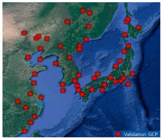 To analyze the accuracy of various frequency matching schemes, a total of 52 validation points were generated using Google Earth by identifying features and recording their geographic coordinates. Figure 4 shows the distribution of validation points. Since slots 12, 13, and 14 were occluded entirely by clouds, no validation points were obtained for these slots. For other slots, four validation points were generated per slot. It is notable that, although we aimed to apply frequency matching to handle slots without shorelines, we collected validation points from the slots with shorelines for quantitative accuracy estimation. For the slots without shorelines, we show the performance of frequency matching through visual inspection. The reported positional accuracies of Google Earth [] are much smaller than the spatial resolution of GOCI images. We expect that validation points obtained in this way are sufficient to check the accuracy of our matching scheme.