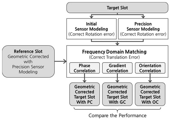 In this paper, we applied frequency matching between a reference slot, to which precision sensor modeling has already been applied using shoreline matching, and a target slot, which needs geometric correction. To accomplish this, we assumed that transformation between the reference slot and the target slot is a rigid transformation, and that the rotation error of the target slot can almost be eliminated using the initial sensor modeling. Figure 5 shows the overall test procedures. We first applied precision sensor modeling to reference slots []. Next, we applied initial sensor modeling to target slots using initial ephemeris data provided by the satellite. We then applied frequency matching between the reference slot and target slot. Furthermore, to validate our assumption that rotation error of the target slot could almost be eliminated using initial sensor modeling, we applied precision sensor modeling to target slots and applied frequency matching between the reference slot and target slot. In this step, we conducted frequency matching schemes based on PC, GC, and OC, respectively, and compared their performance using the validation points.