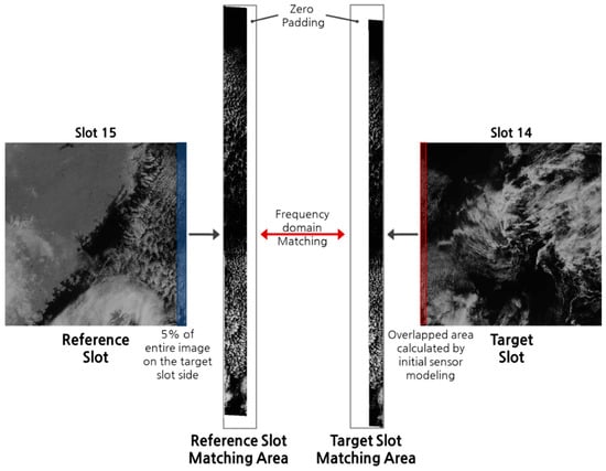 For a valid performance comparison, it is important to select an appropriate matching area between the reference and target slots. In performing frequency domain matching, the closer the matching area is to a real overlapped area, the greater the matching success rate []. Therefore, the matching area needs to be precisely defined. We projected the reference and target slots to an object space with their initial sensor models and set an overlapped area between the projected slot coverages as the matching area of the target slot. For robust frequency matching, the matching area of the reference slot must include the matching areas of the target slot. According to the GOCI slot acquisition scheme, the overlap between adjacent slots does not exceed 5% of the image slot size. Therefore, we set 5% of the reference slot as the matching area of the reference slot. The matching areas defined in this way will have image sizes that are different from each other. We made the size of the reference and target matching areas identical by using zero-padding (Figure 6).