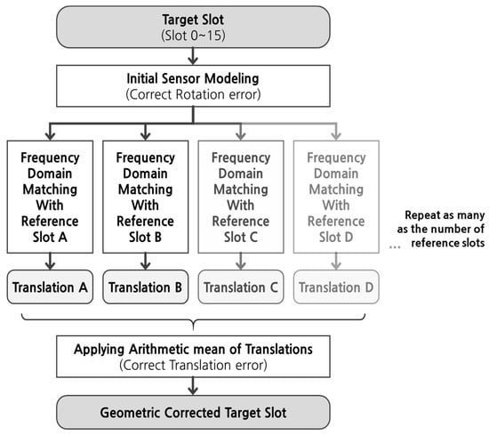 In Table 4, we compared the accuracy of the three frequency domain matching techniques using target slots corrected by initial sensor models and by precision sensor models. We performed this comparison to check the validity of using initial sensor models for correcting target the rotation errors of the slots. We also performed this comparison to check whether frequency matching introduces additional errors to precision sensor models. In the table, ISM represents the initial sensor model errors of the target slots. We corrected the target slots by the initial sensor models and applied the frequency domain matching techniques between the reference slot and target slot. The accuracy of each technique (ISM2PC, ISM2GC, ISM2OC) was checked using validation points. Furthermore, we applied precision sensor modeling to target slots and the accuracy of the precision sensor models was checked using validation points (PSM). We then applied frequency domain matching between the reference slots and the target slots corrected by PSM. We checked the accuracy of each frequency matching (PSM2PC, PSM2GC, PSM2OC) using the validation point.