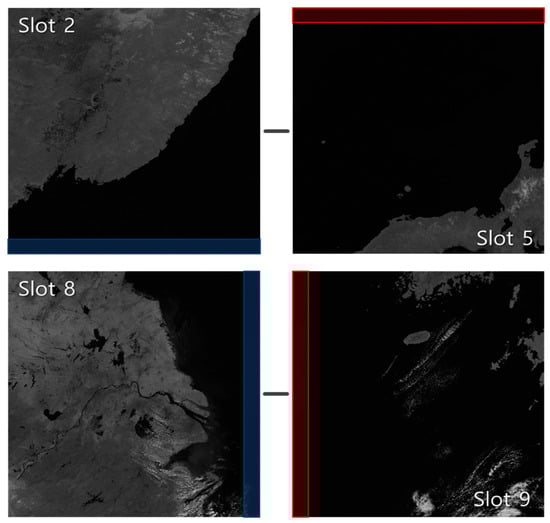 Table 2 shows the frequency matching success rate by slot. The results in this table were obtained by limiting the peak search radius. Table 2 shows that mismatches occurred mostly between specific reference-slot pairs (pair A) such as slots 2–5 and slots 8–9. We found that all these image pairs had an ocean area greater than 95% within the matching areas (see Figure 8). Although we developed frequency matching to handle slots without shorelines, the decrease in the matching success rate over ocean areas was inevitable. Note that one can apply automated outlier detection and removal. In this paper, we focused on the comparison of the frequency matching performance on this harsh environment. In particular, the slot 2–5 pair showed the worst performance among pair A. Since this pair not only had matching areas with an ocean area of greater than 95%, but also a longer time interval than other pairs in the pair A group. Whereas slots in other pair A were acquired consecutively, slot 5 was the third acquired slot after slot 2 acquisition. As more time intervals increased, more changes occurred at ocean textures, and the success rate of the frequency domain matching decreased. When there are clouds with movement, texture change would be more significant and affect the performance of frequency matching. This issue will remain as our future research.