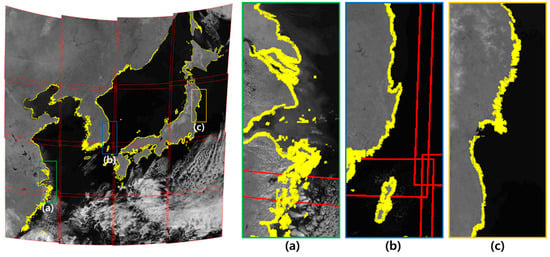 However, not all GOCI slots have sufficient shorelines. For example, slots 0 and 1 in Figure 1 are inland slots, and slots 12, 13, and 14 are over an ocean area without shorelines. It is very difficult to apply shoreline matching over these slots and to robustly estimate the precise geolocation of the image slots. To handle such slots, we proposed a frequency matching scheme, and showed that adjacent slots can be matched by applying frequency matching to the overlapping areas of two slots [,]. We have further shown that frequency matching can be combined with shoreline matching to make one full 1B scene []. From shoreline matching, the absolute orientation of image slots was estimated and from frequency matching, the relative orientation of slots without shorelines. By combining the two matching results, it was possible to mosaic all 16 slots with improved geometric accuracy.
