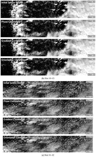 In all experiments, the reference slots were corrected by precision sensor models. The results of frequency domain matching in Table 4 were obtained by limiting the peak search radius. In every slot, the geometric error of the initial sensor modeling (ISM) was reduced by using frequency domain matching, ISM2PC, ISM2GC, and ISM2OC. Their errors were larger than the cases with the target slots corrected by PSM or by PSM2PC, PSM2GC, and PSM2OC. However, the differences were not very big, indicating that the frequency matching scheme proposed here could be used for slots without shorelines and that correcting target slots by initial sensor models could be sufficient for applying frequency matching.