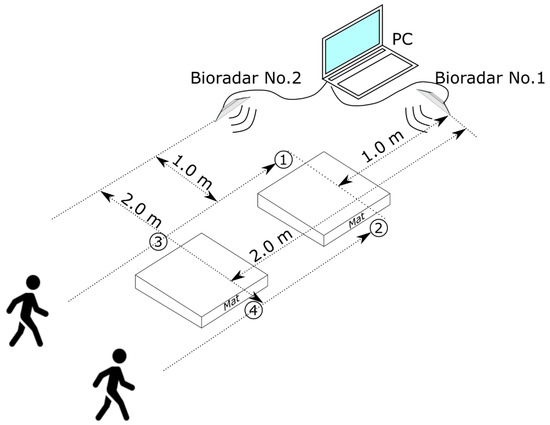Unlike other works in which falls were performed at the same place of the experimental scene [18,22,23,24], in the present work we try to solve a more challenging task, namely to detect falls performed at different positions. To do so, the volunteer was asked to enter the room and imitate falling or normal daily activity while reaching one of four points (points 1–4 in Figure 4), thus the range between the subject and the radars varied from 1.0 to 2.0 m, moreover, for points 3 and 4 in Figure 4, the volunteer was only partially observed by bioradar No. 2.
