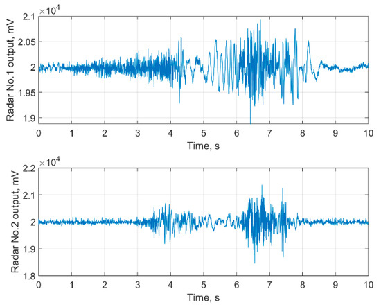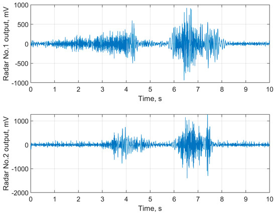 In Figure 5, examples of raw data (I quadratures) with a single fall episode registered by frontal and lateral oriented bioradars are shown. An example of raw data labeled as ‘not fall’ for the same radars is given in Figure 6.