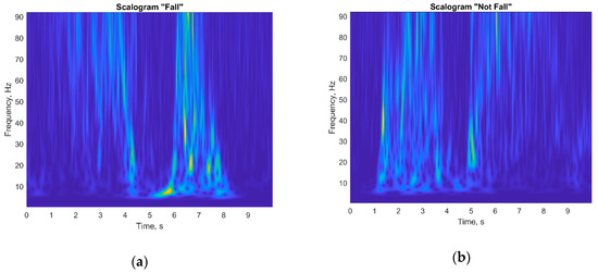 Scalograms of filtered signals for frontal-oriented bioradar: (a) with human fall occurring at 6.1 s; (b) without fall.