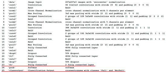 Originally, the last three layers of AlexNet were configured for recognizing 1000 categories. The following changes were made to these layers to adapt this CNN to the fall classification problem. Layer 23, the fully connected layer, was set to have the same size as the number of categories in our radar data. Layer 24 applies a softmax function to the input, so no changes are needed. The Classification Output (layer 25) holds the class labels. Since there are two bioradar data categories (‘fall’ and ‘not fall’), we set layer 23 to be a fully connected layer with two nodes, and layer 25 was set to be the classification output layer with classes ‘fall’ and ‘not fall’. The architecture of the used CNN is given in Figure 9, where red lines indicate the modified layers.