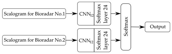 To create a more robust classifier, we used data from both bioradars to train CNN (denoted by CNN12). In this case, the scalograms for bioradars No. 1 and No. 2 were processed by CNN12 separately, and the probabilities estimated by the softmax layer 24 for both scalograms were combined. The output class was picked as the class with the highest probability as is shown in Figure 10. The classification results for a multi-bioradar system are listed in Table 4.
