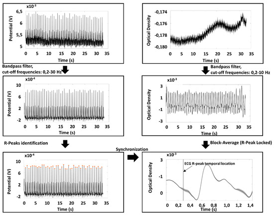 Raw PPG signals were converted into optical densities (ODs) [24]. Raw ODs and ECG signals were filtered by employing band-pass, 4th order, zero-lag, Butterworth digital filters. For PPG, the cut-off frequencies were set at 0.2 and 10 Hz; for ECG, the cut-off frequencies were set at 0.2 and 30 Hz. The ECG R-wave peaks were identified considering the local maxima on a filtered and normalized (z-score) Lead I ECG signal, defining some constraints (minimum value of the peak: 3; interpeak distance: 600 ms). The procedure provided an excellent automatic R peak identification without the need of any manual correction after visual inspection.