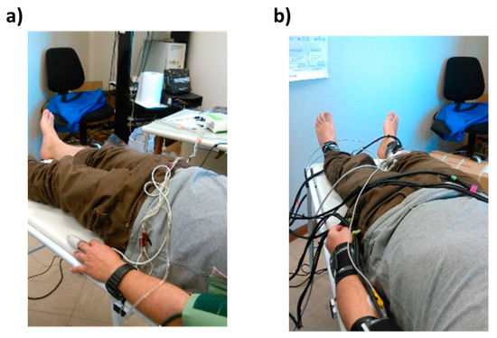 Moreover, in order to test the ability of the system to estimate parameters indicative of vascular ageing, 78 healthy participants with a large age range (from 20 to 80 years of age) were enrolled in the study. Cross-sectional correlation between participants’ age and left and right baPWV was estimated, exploiting the known monotonic associations between age, arterial stiffness, and PWV [30]. Finally, the performance of the system in estimating the baPWV was assessed through comparison with a commercial system, namely, the Enverdis Vascular Explorer (VE) (Düsseldorf, Germany) [31,32]. A Bland–Altman plot, paired t-test, and correlation analysis were performed to test the consistency of the two measurements. Figure 5 shows an in vivo measurement during the VE evaluation (Figure 5a) and ECG–PPG signal acquisition (Figure 5b). It is worth noticing that VE had only two probes, hence the left and right sides of the body had to be investigated separately, increasing the examination duration.