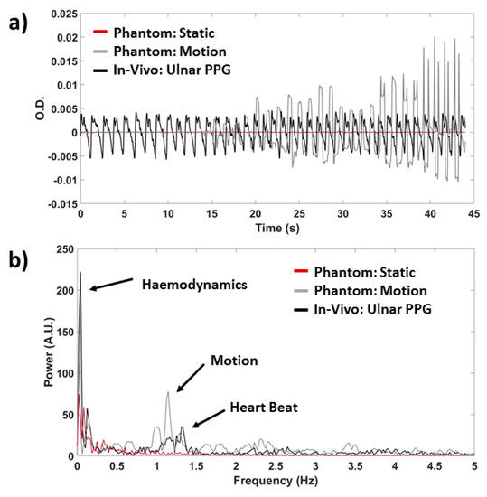 Example of cross-talk results for three randomly selected PPG probes (a) in the time and (b) in the frequency domain. Signals are reported for the probe subject to motion (grey), for the control measurements on an optical phantom (red) and on the ulnar artery of a subject (black).