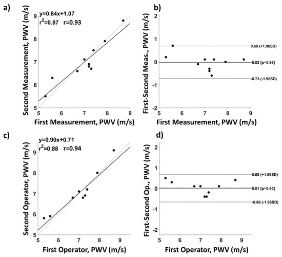 Figure 8 reports the intra- (Figure 8a,b) and extra-operator (Figure 8c,d) average left and right baPWV repeatability analysis performed on 10 subjects. Figure 8a,c are correlation plots, whereas Figure 8b,d are Bland–Altman plots. For the intra-operator measurements, the root-mean-square error (RMSE) of the velocity was 0.35 m/s, the correlation coefficient was 0.93, and the paired t-test did not show significant differences between the two measurements (t(9) = 0.17; p = 0.86). For the extra-operator repeatability, the RMSE was 0.35 m/s, the correlation coefficient was 0.94, and the paired t-test was not significant (t(9) = −0.09; p = 0.93).