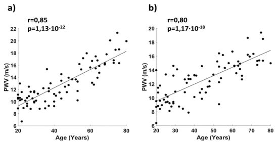 Figure 9 reports the correlation between age and baPWV for a cohort of 78 healthy participants. A good correlation was found for both the right side (r = 0.85, Figure 9a) and the left side of the body (r = 0.80, Figure 9b).