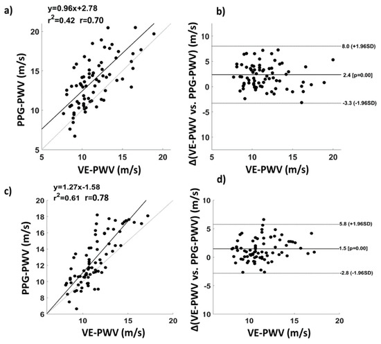 Comparison between VE and the ECG–PPG developed system in estimating baPWV. (a) Correlation and (b) associated Bland–Altman plot of baPWVs evaluated through the two instrumentations for the right side of the body; (c) correlation and (d) associated Bland–Altman plot of baPWVs evaluated through the two instrumentations for the left side of the body.