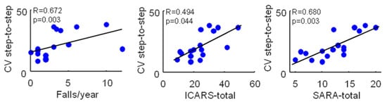 Surprisingly, no correlation was found between HR in all directions, falls/year, and clinical severity (ICARS and SARA scores) (Table 3), while a significant positive correlation was found between the CV of step length and the falls/years and ICARS and SARA scores (Figure 1).