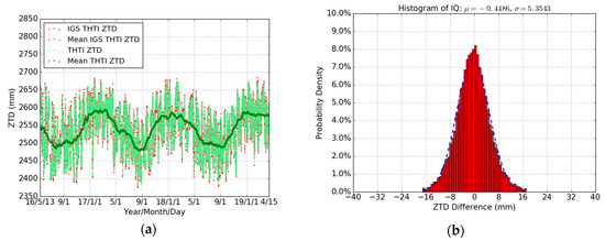 The THTI station consists of a SEPT POLARX5TR receiver with a LEIAR.R425.R3 antenna, and the FAA1 station consists of a SEPT POLARX4 receiver with a LEIAR.R4 antenna. GPS satellite precise orbits and clocks as well as consistent Earth-rotation parameters were provided by the Center for Orbit Determination in Europe (CODE). Together with the Bernese GNSS Software Version 5.2 with PPP approach, hydrostatic and wet Vienna Mapping Function 1 (VMF1) were used to estimate the THTI and FAA1 ZTD estimates with a resolution of one hour [23,24,25]. To validate the accuracy of our ZTD estimates, we made a comparison with the IGS Final troposphere products (ftp://cddis.gsfc.nasa.gov). Details of both data processing strategies (ours and IGS) are summarized in Table 1. The Bernese 5.2 instead of Bernese 5.0 is used by IGS products from the day of year 29 in 2017. The definitions of bias, root mean square (RMS) and standard deviation (STD)) are shown in Appendix A.