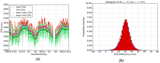 In this section, we give the comparisons of THTI ZTD and FAA1 ZTD estimates based on our GPS data processing over three years (May 2016 to April 2019), with respect to the IGS Final tropospheric products. The temporal resolution is one hour. As displayed in Figure 2a,c, it can be noticed that the GPS-derived ZTD from our GPS data processing agrees very well with the corresponding ZTD from IGS Final products, for both stations (except from 9 July to 13 August 2018 with no GPS data measurements). Figure 2b,d and Table 3 show the distributions of their differences, after removing off the outliers (±3 sigma). They are close to Gaussian distributions. The ZTD differences are probably mainly due to the details of the algorithms and strategy used, with no significant systematic biases. The root mean square (RMS) values of ZTD differences are 5.37 mm at the THTI site and 8.21 mm at the FAA1 site. FAA1 is located near sea-level, and this may be the cause of its slightly lower accuracy with respect to the IGS Final products.