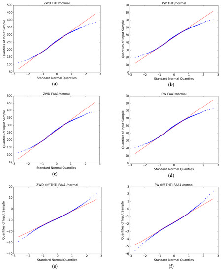 The question of focus is now: Are the time series of differences in ZWD and PW estimates between the two stations “signal” or “noise”? To assess this question, we first made cross-comparisons between ZWD and PW time-series estimates versus a normal distribution by using quantile–quantile (QQ) plots (Figure 9a,d) for the THTI and FAA1 stations. All the distributions of ZWD and PW estimates shown in the figures are clearly non-Gaussian, with heavy tails, meaning that extreme values are more likely to be found than in a normal distribution. This has been noted for PW estimates by Iassamen et al. (2009) [52] who proposed a Weibull distribution. This heavy tails distribution can also be seen in the distributions of the differences between the PW and ZWD values (Figure 9e,f), albeit one expects that these differences will be naturally closer to a “white noise”, i.e., a Gaussian distribution. Figure 9g–j shows that the time series of ZWD and PW differences are also statistically unrelated to the ZWD and PW native series.