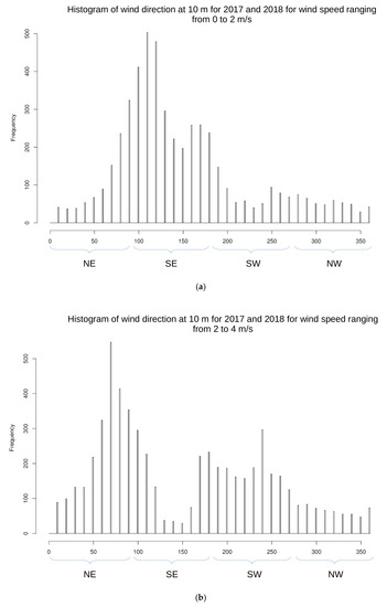 Histogram of 10 m wind direction at FAA1 for 2017–2018 (a) for 0 to 2 m/s, and (b) for 2 to 4 m/s, and (c) for 4 to 10 m/s. North-east direction is indicated by “NE” and spans 0° to 90°, south-east direction is indicated by “SE” and spans 90° to 180°, south-west direction is indicated by “SW” and spans 180° to 270°, north-west direction is indicated by “NW” and spans 270° to 360°. The corresponding wind rose is shown in Figure 14.