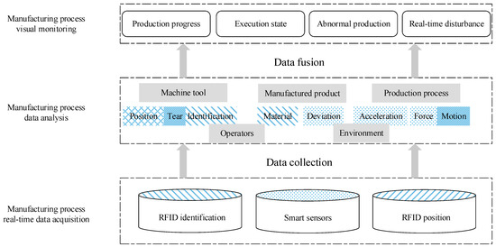 Given the distribution and functional characteristics of various production factors in manufacturing systems, such as equipment, humanity, materials, tools, and WIP, various types of sensing devices such as radio frequency identification (RFID), sensors, and ultra-wideband, are deployed on the shop floor. The interconnection and data collection of various production factors ensure reliable real-time acquisition of multi-source information generated by production activities.