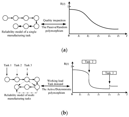 The valuable outputs of manufacturing systems is the final manufactured products with limited makespan and production quality. For the reliability model of production task-oriented manufacturing systems, considering the impact of multiple task requirements on system reliability is necessary. Considering the previous discussion, we can conclude that sensor technology development in intelligent manufacturing provides enough operational data for multi-tasking reliability evaluation of manufacturing systems with multiple production tasks, especially the real-time multi-source data in the shop floor. Therefore, manufacturing system reliability changes with the performance degradation of manufacturing equipment and dynamic scheduling, including workload adjustment and system constitution. The following are the variations of manufacturing system reliability considering dynamic production tasks.