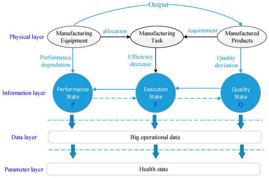 Figure 3 displays that the mission reliability of manufacturing systems is closely related to the performance state of manufacturing equipment, execution state of production tasks, and quality state of manufactured products. The three jointly determine the possibility that manufacturing systems can complete the specified production tasks with time and resource constraints. Moreover, the health state of manufacturing systems that characterizes the ability to perform functions is related to the three elements. The performance state of manufacturing equipment is the basis of the health state of manufacturing systems. Performance state also expects the decline of health state. The quality state of manufactured products is determined by the performance state of corresponding manufacturing equipment, which is a direct reflection of the health state of manufacturing systems. The execution state of production tasks focuses on the dynamic state changes of manufacturing systems under different mission profiles.