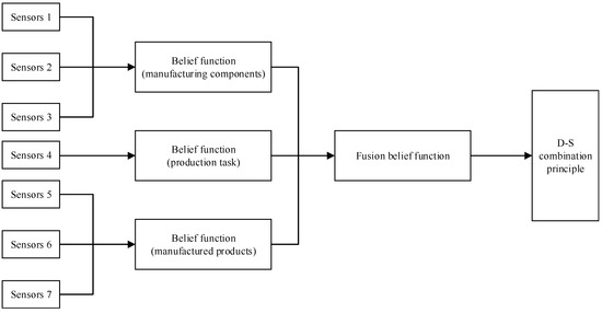 The health state of manufacturing systems is divided into three levels—a high performance state, a medium state, and a low state. The three aspects of data fusion—degradation of manufacturing components, increase in processing time, and degradation of the quality deviation of manufactured products—are the evident sources for the final decision making of manufacturing equipment’s performance state. The final performance state category is determined by the fusion diagnosis process as shown in Figure 5.