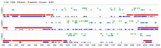 UbiqLog [19]: An open source Android-based life logging tool [20] has been used to create the UbiqLog dataset. It includes 9.78 million records of users’ detected WiFi, Bluetooth, application usage, SMS, call, physical activity (based on Google Play Services) and geographical location. The capacity for location extraction varies based on availability and device status, e.g., GPS, Cell-ID and Google Play Services Location API. Figure 1 shows a visualization of three days of a single user’s data in the UbiqLog dataset. The x-axis represents the time of the data, and each sensor has a different color. Table 1 provides details about the UbiqLog dataset records, whilst another report [11] describes more about the data collection experiment. All records are semantically rich and are human readable. Therefore, there is no raw sensor data, such as accelerometer data, in this dataset.