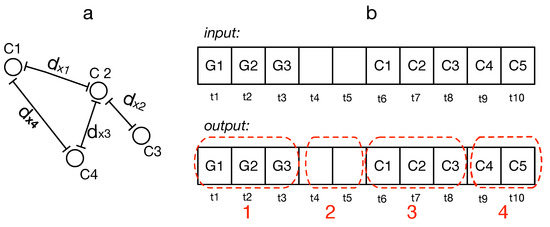 The UbiqLog dataset shows that most of the time GPS is turned off (based on its real-world nature), there are very few GPS logs and they occur mostly when users are navigating. Most location logs are from Cell-ID; and thus it is not possible to precisely estimate location (because of relying on Cell-ID instead of precise coordinate) [25]. In particular, when the location change is noted, there is an ambiguity as to whether the location has truly changed or just the cell tower has changed (i.e., handoff). Nevertheless, there is a fixed precision associated with the location extracted from the Cell-ID. Let us assume the precision distance is , (in the city of the UbiqLog experiment, the precision distance between Cell towers was 800 m) and a temporal precision . To understand this problem, consider the example in Figure 3a. There we have . If , this means that the user is moving. If but the distance between and , then the user is inferred to be stationary and not moving. Therefore, when the algorithm calculates only the distance between two consecutive points, it might face a problem. To resolve this issue, when the location is based on Cell-ID, the algorithm calculates the location distance between three consecutive points rather than two. Figure 3b shows a trace, which has a combination of GPS(G) and Cell-ID(C) locations. It shows that four Cell-IDs have been recognized and C4 has not been categorized as the same event. Based on cell tower distribution [26], must be 800 to 1000 m (cell tower distances) to check whether or not there is a location change or not, and five minutes has been assigned to .