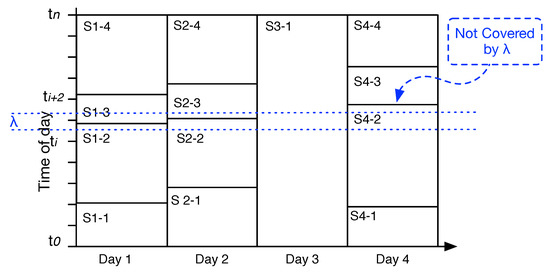 Human behavior slowly evolves over time [1], which means, among other phenomena, similar events and their timings will change over time. To resolve this issue, will be moved between days, but it is a fixed variable. In particular, the algorithm will not use one day as a benchmark and then compare the other days to that single day. Figure 4 neglects the spatial property of an event for the sake of readability, and visualizes the problem of not moving . The example shows four days within their temporal events identified. S1-3 and S2-3 could stay in the same cluster, but S4-3 is not covered by the threshold, despite the fact that we can see it belongs to the same cluster. In addition, S1-2 and S2-2 have a similar end time, but if we do not move , S4-2 also lacks a similar end time.