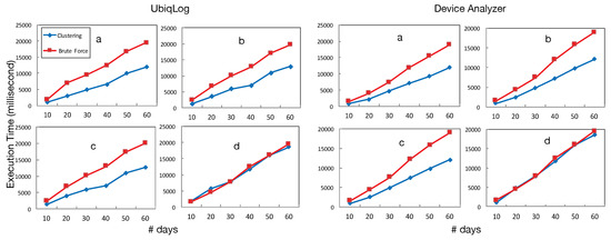 To parse the user input, we have used a light query engine [34] that can parse Quantified-Self queries on mobile and wearable devices. Numbers presented in Figure 7 are averaged among all users in each dataset, i.e., they present an average user time required for queries on the smartphone. However, Figure 7d has no notion of time or location. Figure 7 demonstrates the significant impact of the clustering algorithm on search execution time for both datasets. The improvement increases with the size of the data. However, query (d) that does not include either a notion of time or location does not have any significant difference with the brute force method.