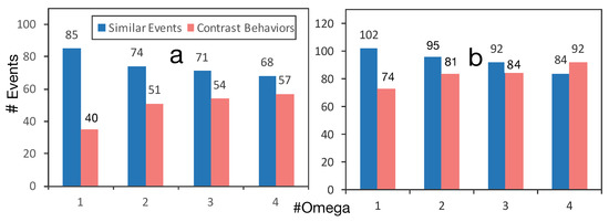 where function denotes all actions inside the event e. If the comparison between two events returns fewer than actions, then the output is false (0), otherwise this function returns true (1). False output means these events are not significantly different (i.e., not contrasting behaviors). Our experiments mostly show that events inside a cluster have a similar number of actions; therefore, there is no need to use a Jaccard similarity, just relying on the intersection is enough. Going back to the example of User1, if number of actions (e.g., physical activities that can be measured via an accelerometer) that she performs in her two gym sessions are different, then the two gym events are considered contrasting events, e.g., cardio versus free weights. Therefore, the problem of contrast event detection can be formalized as: