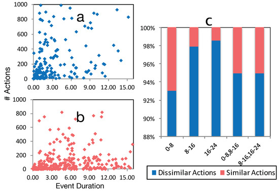 (a) distribution of similar actions (not events); (b) distribution of dissimilar actions; both (a,b) were based on event duration using ; (c) ratio of similar actions inside events of each cluster, distributed among different temporal segments.